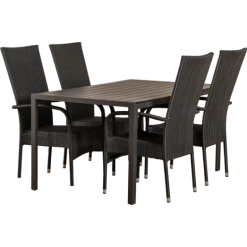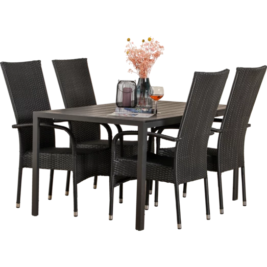 Sandro havebord er for dig, der ønsker et klassisk havebord, der ikke går på kompromis med kvalitet og funktionalitet. Havebordet er fremstillet af vedligeholdelsesvenlige sorte nonwood struktur planker og tilhørende sort aluminiumsstel, som giver et råt look. Til havesættet medfølger 4 Korfu havestole med høj ryg fremstillet i vedligeholdelsesvenligt sort 4-string polyrattan med tilhørende stålstel. Havestolen er godkendt op til 110 kg og kan stables.