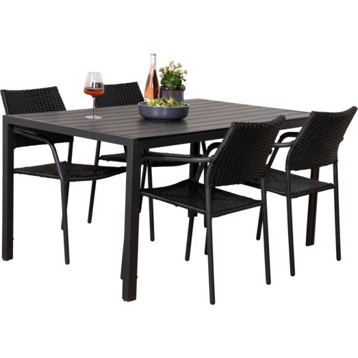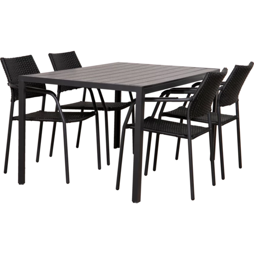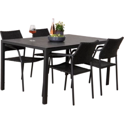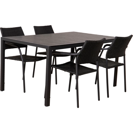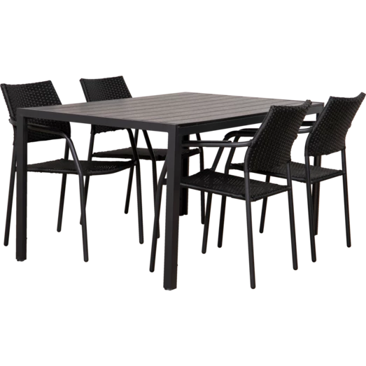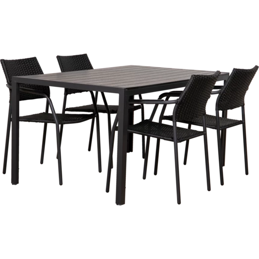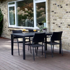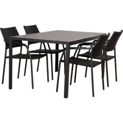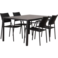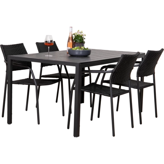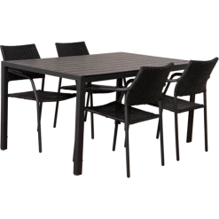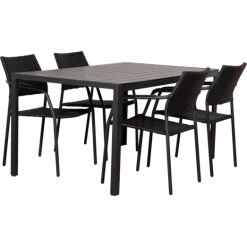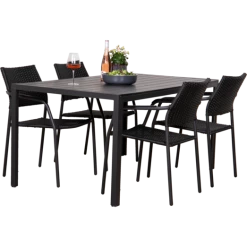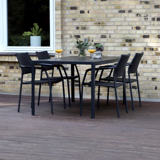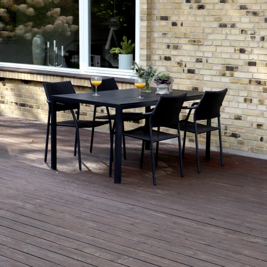 Sandro havebord er for dig, der ønsker et klassisk havebord, der ikke går på kompromis med kvalitet og funktionalitet. Havebordet er fremstillet af vedligeholdelsesvenlige sorte nonwood struktur planker og tilhørende sort aluminiumsstel, som giver et råt look. Der medfølger 4 Søby cafestole i sort vedligeholdelsesvenligt 4-string polyrattan og sort metalstel. Havestolen er godkendt op til 110 kg og kan nemt stables.