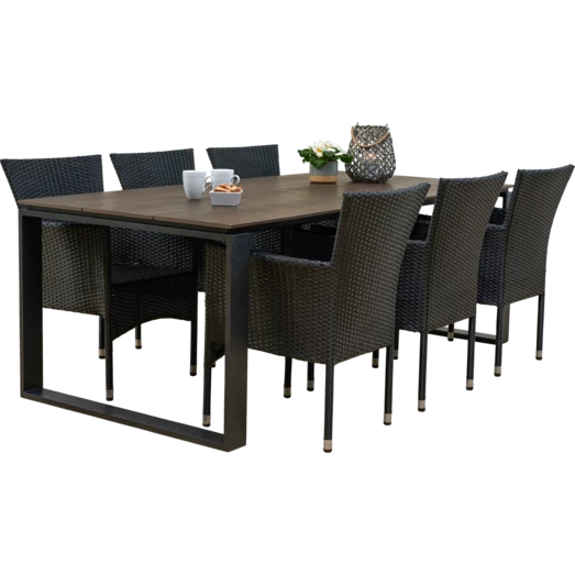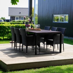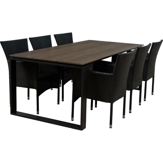 Flot sæt med Tårup havebord, som giver et naturligt og lækkert udtryk til terrassen og andre udendørsområder. Havebordet er fremstillet med 3 vedligeholdelsesvenlige mørkebrune nonwood planker og sort aluminiumsstel. Der medfølger Bali havestole produceret i sort 4-string polyrattan flet med antirust-behandlet stålstel, hvilket gør den nem at vedligeholde. Havestolen er godkendt op til 110 kg og kan stables, hvilket gør den nem at opbevare hvis vejret ikke tillader hygge på terrassen eller når sæsonen skifter.