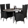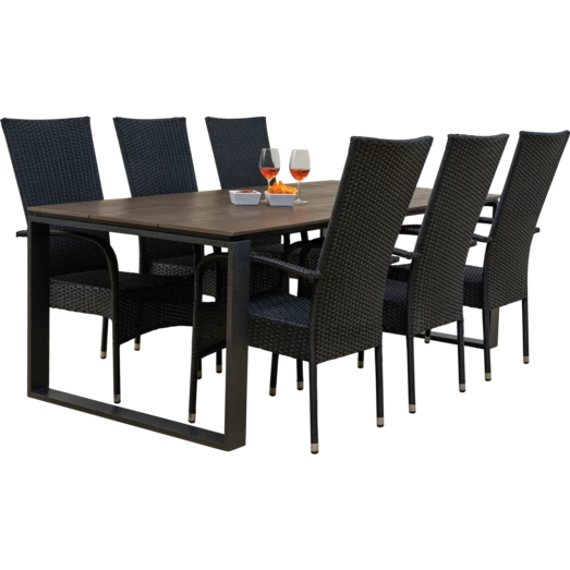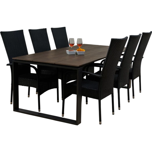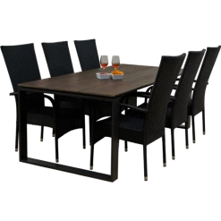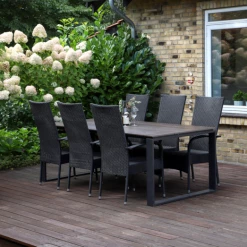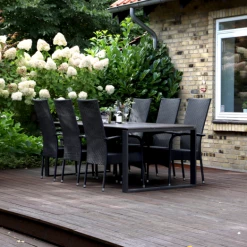 Flot sæt med Tårup havebord, som giver et naturligt og lækkert udtryk til terrassen og andre udendørsområder. Havebordet er fremstillet med 3 vedligeholdelsesvenlige mørkebrune nonwood planker og sort aluminiumsstel. Der medfølger Korfu havestole i sort 4-string polyrattan med høj ryg og stålstel, som er godkendt op til 110 kg. Havestolene kan stables, så de nemt kan opbevares uden at fylde meget, når de ikke er i brug i vinterhalvåret. For ekstra komfort kan der tilkøbes havehynder, se vores udvalg af havehynder her.