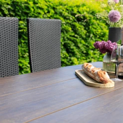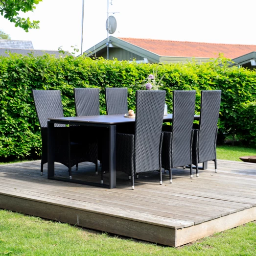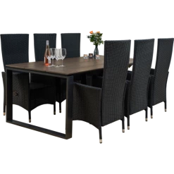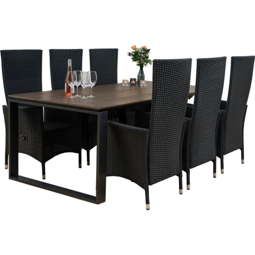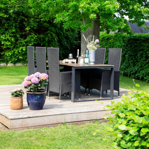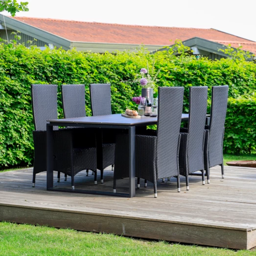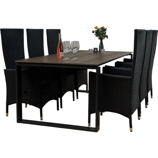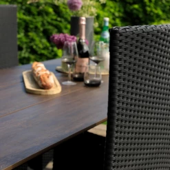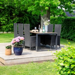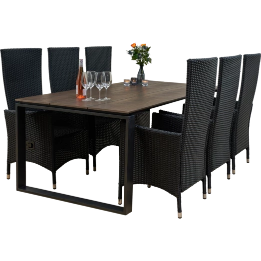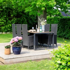 Flot sæt med Tårup havebord, som giver et naturligt og lækkert udtryk til terrassen og andre udendørsområder. Havebordet er fremstillet med 3 vedligeholdelsesvenlige mørkebrune nonwood planker og sort aluminiumsstel. Til bordet medfølger Samsø havestol produceret i sort nonwood materiale, 4-string polyrattan og stellet i sort aluminium, hvilket gør stolen meget nem at rengøre. Havestolen er godkendt til op til 110 kg .
