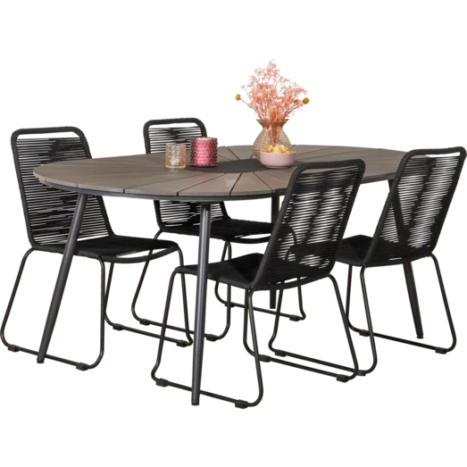 Der medfølger 4 Nyby havestole, som er utroligt behagelige at sidde i, takket være stolens design og materialevalg i stolens sæde og ryg, der former sig efter din krop. Havestolens reb er UV-beskyttet og stellet er i sortlakeret stål. For ekstra komfort kan der tilkøbes havehynder, se vores udvalg her.