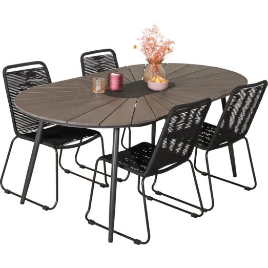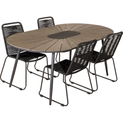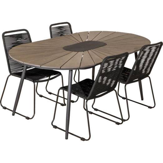 Dette havemøbelsæt består af det runde havebord Tibberup, som er fremstillet af nonwood planker i en flot Cappucino farve med en sort spraystone plade i midten af bordpladen. Hertil har havebordet sortlakeret aluminiumsstel, som gør havebordet både robust og let at flytte rundt på.